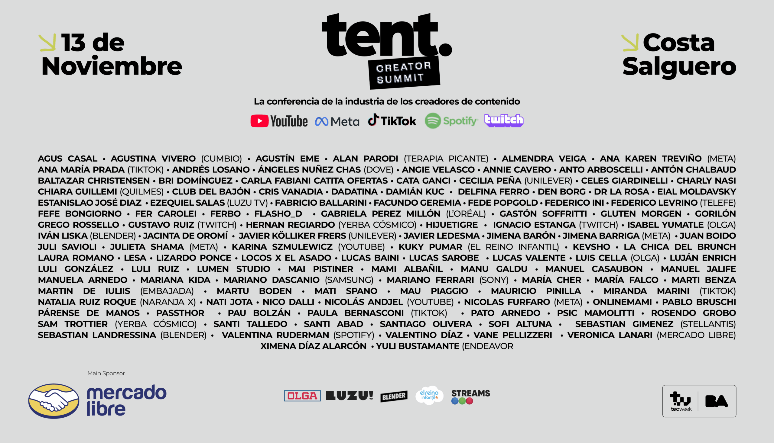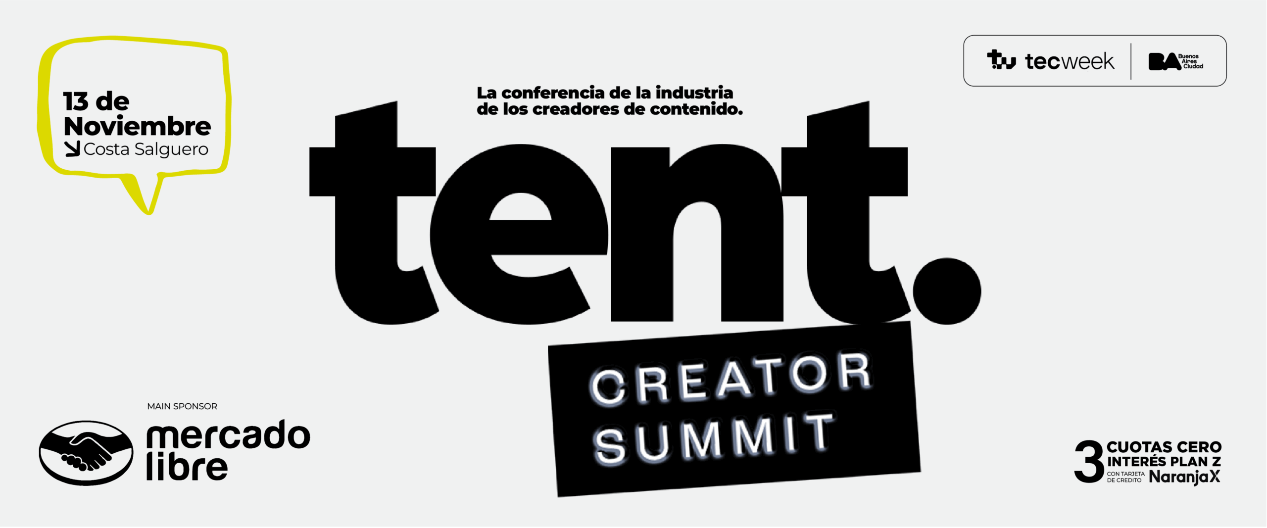 Tent Creator Summit es la primera conferencia de la industria de la creación de contenido en Argentina. Nace con la idea de ayudar a que el ecosistema de la creación de contenido cuente con un espacio de aprendizaje, interacción y negocio para todos los que forman parte del mismo: creadores, plataformas, marcas, agencias, canales, managers, editores y productoras, entre otros.